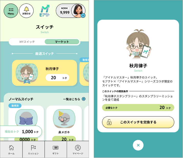 ※「コラボ限定スイッチ」を交換するには、各アイドルごとのスタンプラリーミッションをすべてクリアする必要があります。ミッションが1つでも審査NGになると、「コラボ限定スイッチ」を獲得できなくなりますのでご注意ください。