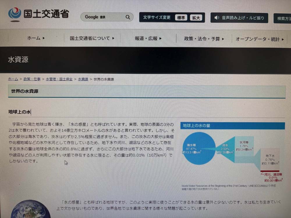 限られた水資源の現状と世界での水不足問題を知り、水資源の重要性を理解する