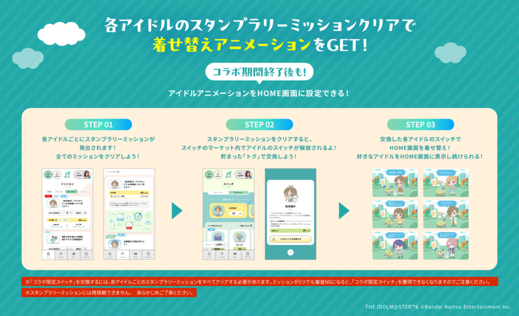 ※「コラボ限定スイッチ」を交換するには、各アイドルごとのスタンプラリーミッションをすべてクリアする必要があります。ミッションが1つでも審査NGになると、「コラボ限定スイッチ」を獲得できなくなりますのでご注意ください。