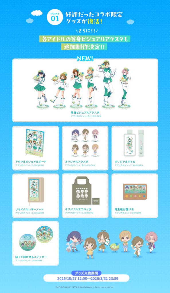 ミッションをクリアして貯めたポイントは、『アイドルマスター』シリーズのコラボ限定グッズと交換可能です。