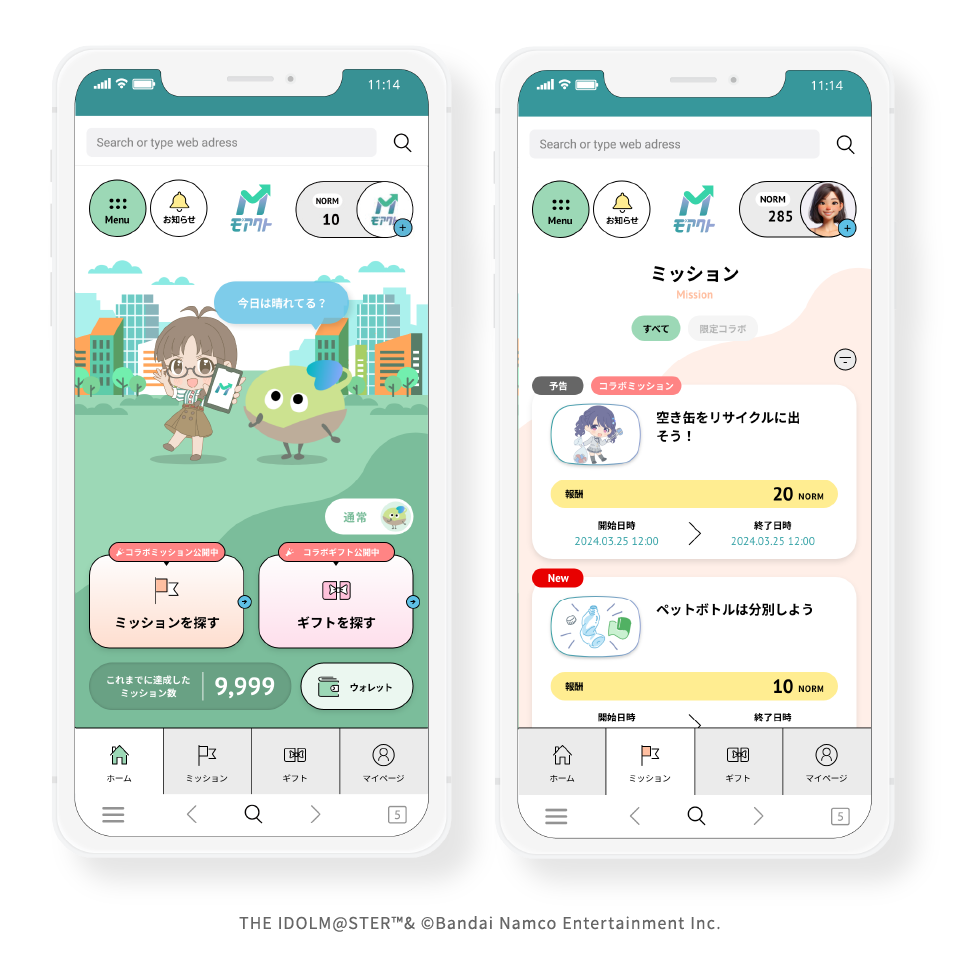アプリ内で出題されるミッションをクリアしてポイントを貯めると、『アイドルマスター』シリーズのコラボ限定グッズと交換可能になります。