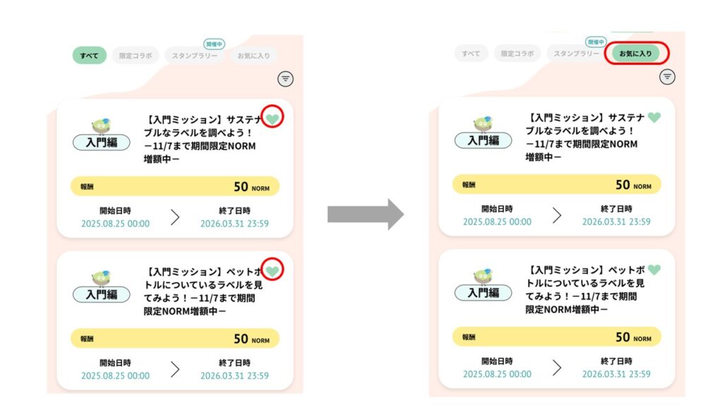ミッションページの上部にあるお気に入りタブにまとめて表示されます💡