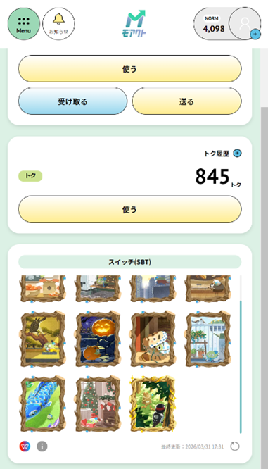 発行されたスイッチ(SBT)は、これまで通りモアクトアプリ内のMYスイッチに加え、新たにマイページ内「マイウォレット」、およびHashPort Walletアプリ内の「NFT」タブから確認できます。